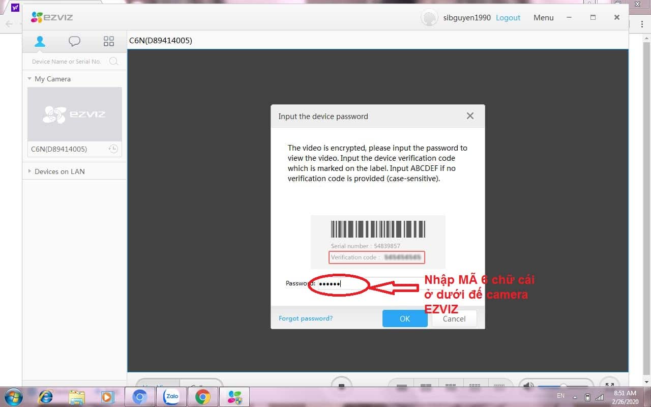 - ➤ Bước 4: Nhập mã 6 chữ cái xong nhấp “OK”. Cuối cùng kiểm tra hình ảnh của camera EZViz đã xuất hiện trên máy tính hay chưa.